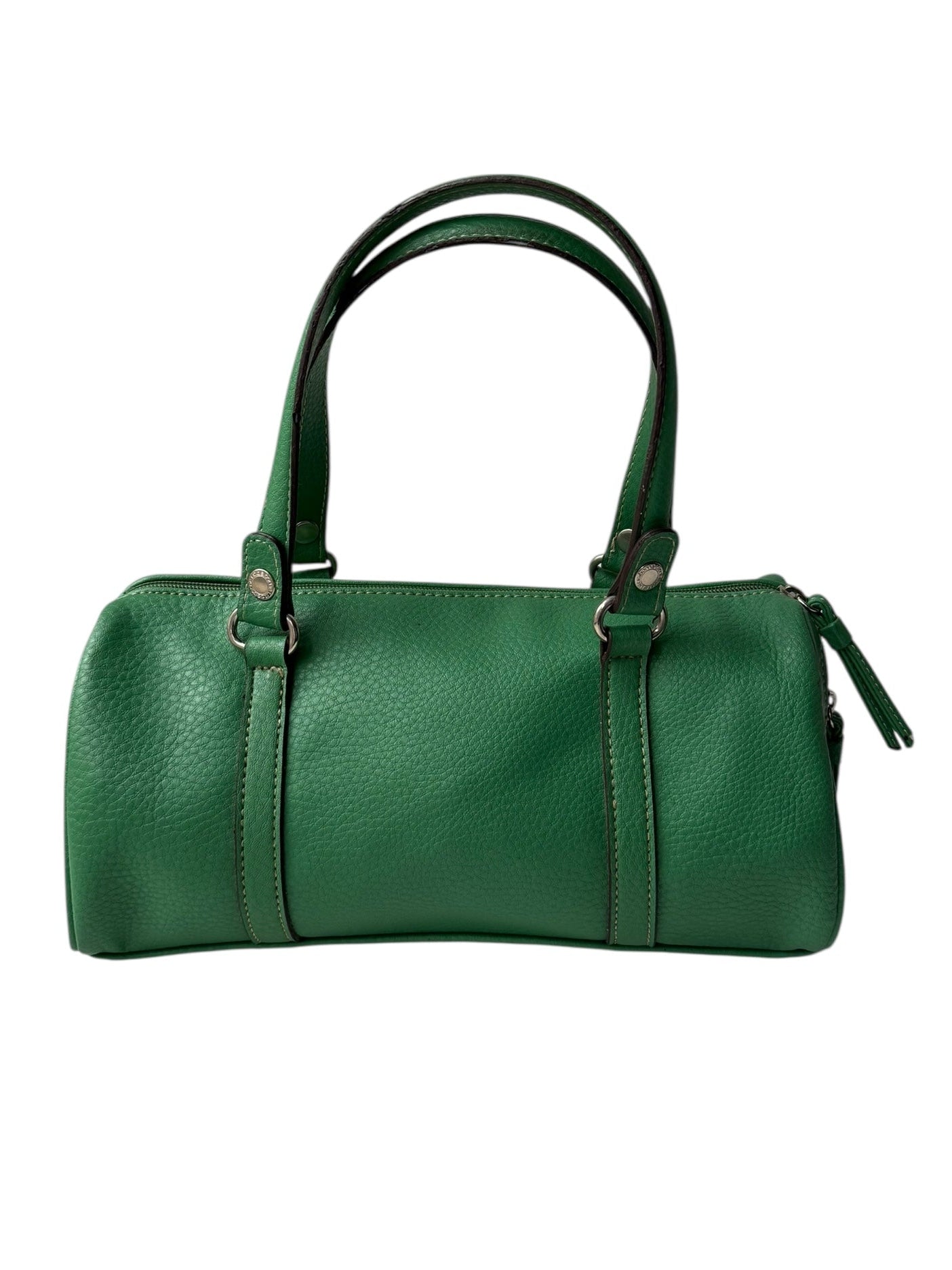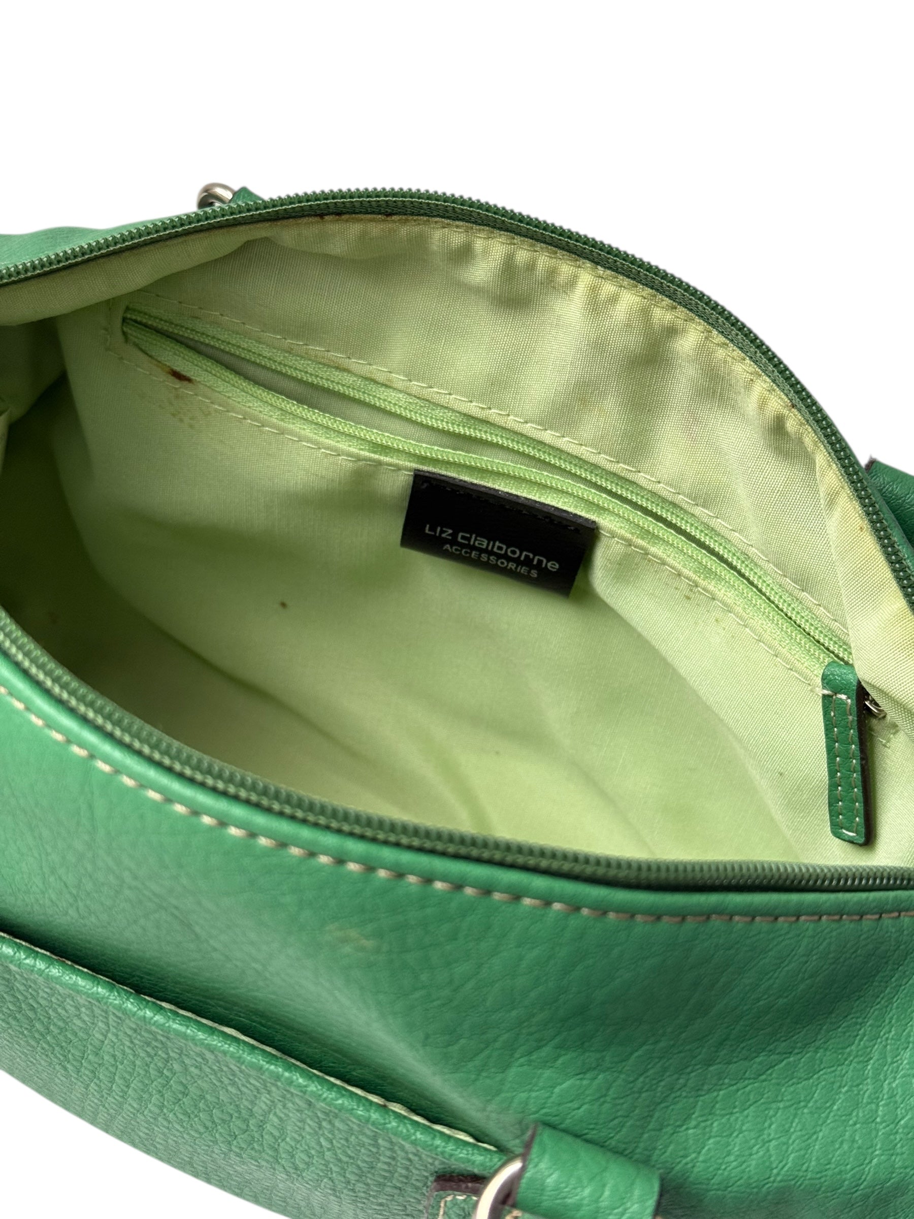 Liz Claiborne green leather purse — bold color, barrel shaped, effortless vintage cool.