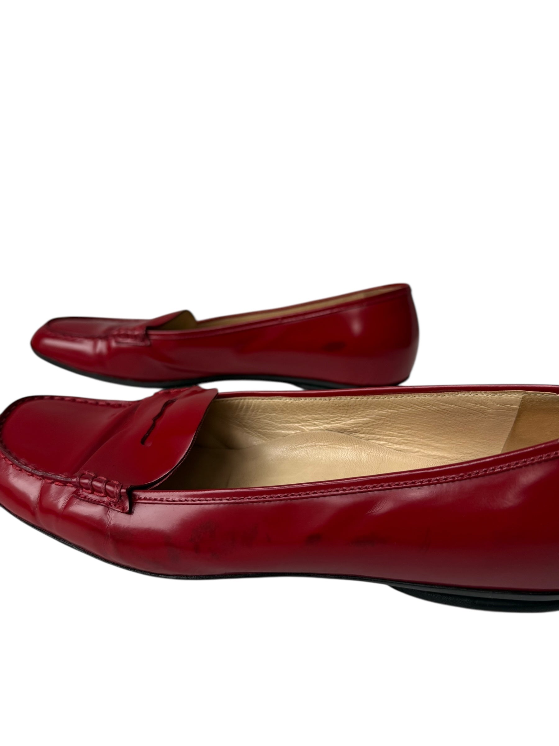Vintage Prada loafers in smooth red leather, featuring a classic shape and polished finish. A vibrant take on a forever staple. Mild marks and signs of wear as pictured. Size EU 40
