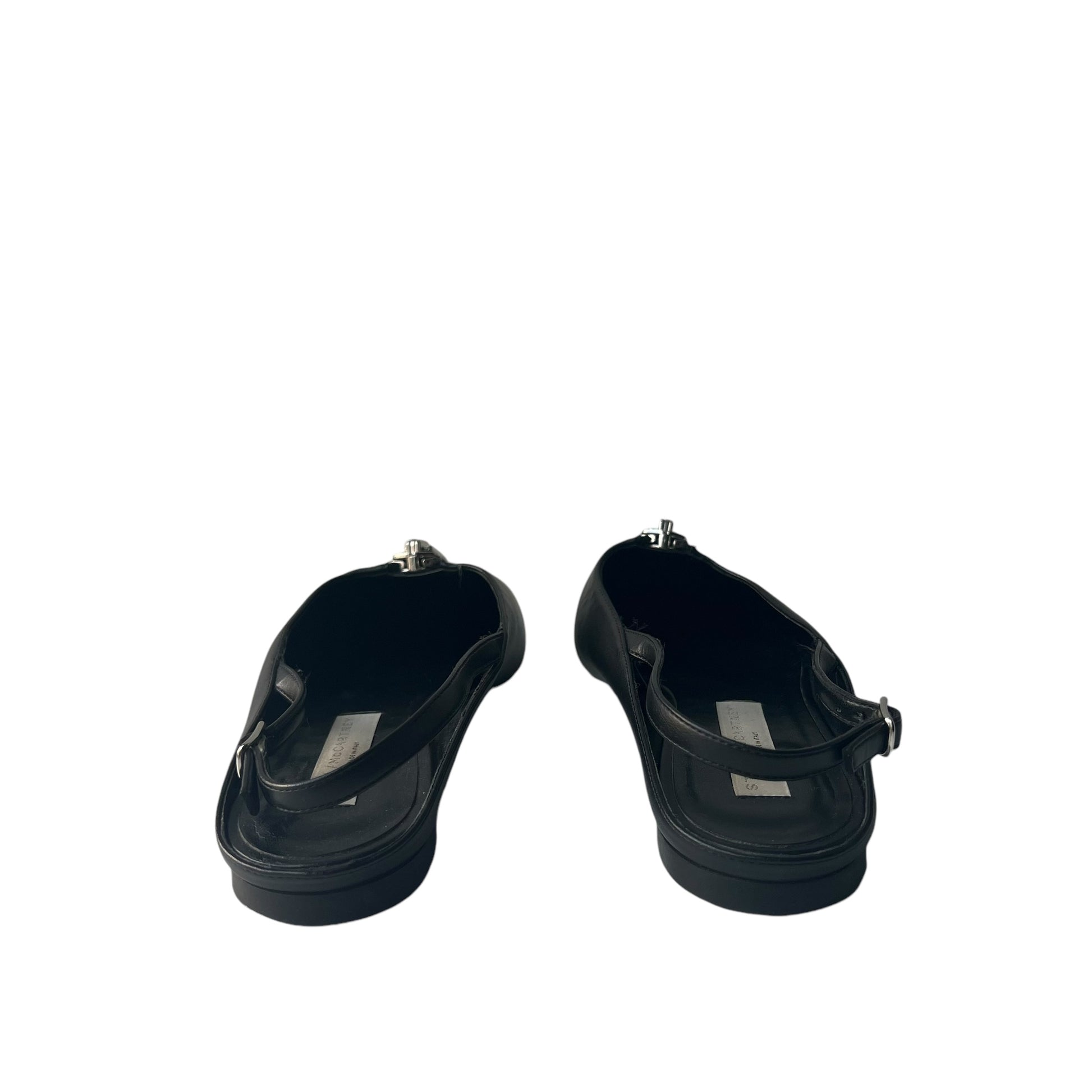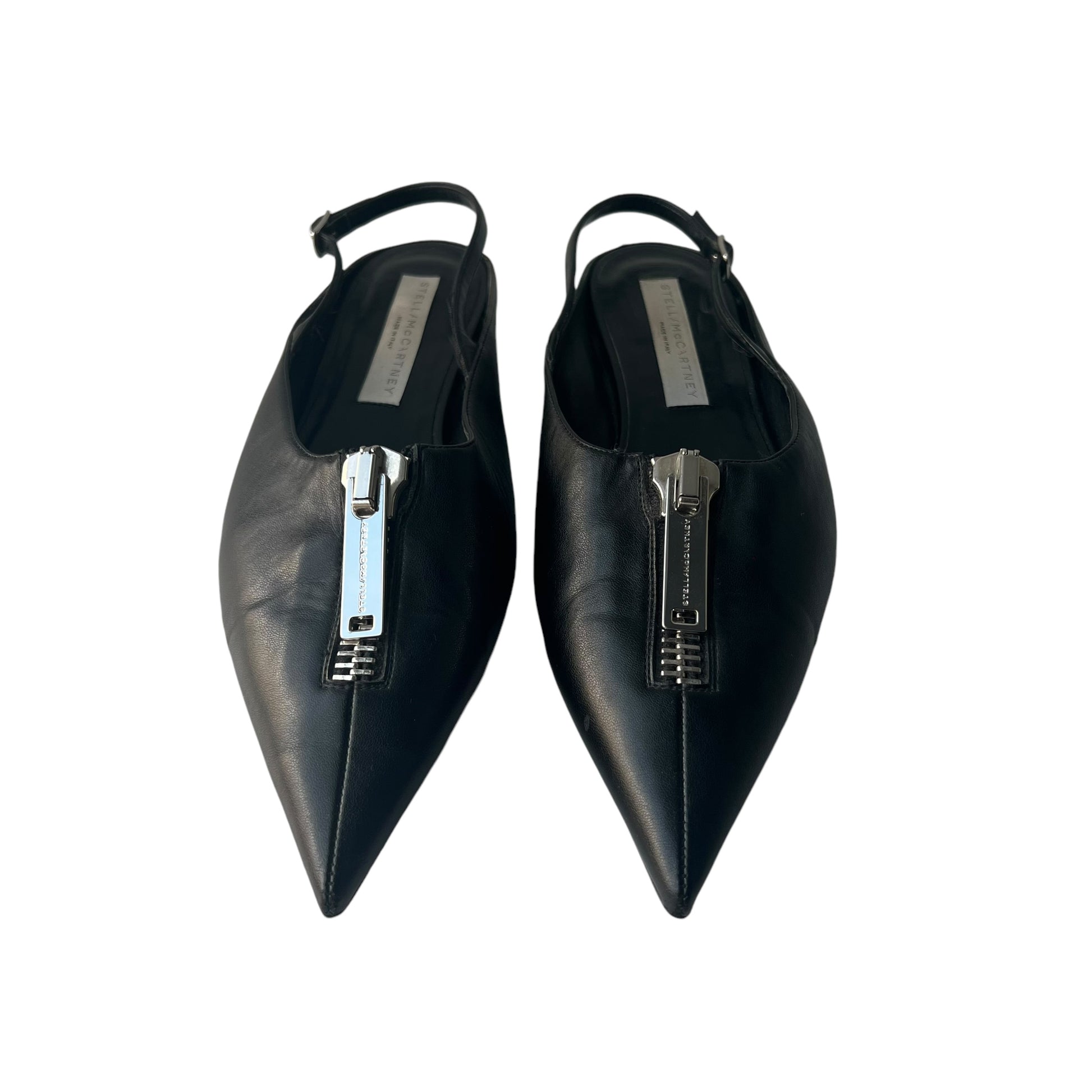 Effortlessly chic in sleek black, these slingback flats from Stella McCartney feature a pointed toe and edgy zipper detail—an elegant fusion of comfort and fashion-forward design. Size: EU 37.5